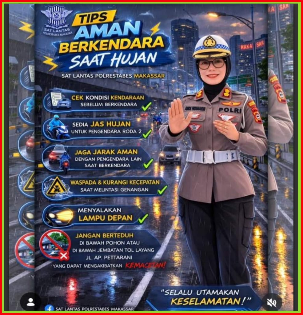 intelijen Tipikor. my. id Makassar — Kasat Lantas Satlantas Polrestabes Makassar, AKBP Hj. Andi Husnaeni, mengingatkan para pengendara untuk selalu memastikan kondisi kendaraan sebelum digunakan, terutama saat musim hujan.