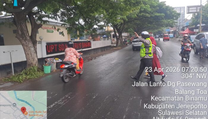INTELIJEN TIPIKOR. MY. ID Jeneponto, 23 April 2026 – Hujan yang mengguyur wilayah Kabupaten Jeneponto sejak dini hari tidak menyurutkan semangat personel Satuan Lalu Lintas Polres Jeneponto dalam memberikan pelayanan terbaik kepada masyarakat. Pada Kamis pagi (23/4/2026), para petugas tetap terlihat aktif di sejumlah titik ruas jalan, membantu kelancaran lalu lintas dan mengutamakan keselamatan pengguna jalan.